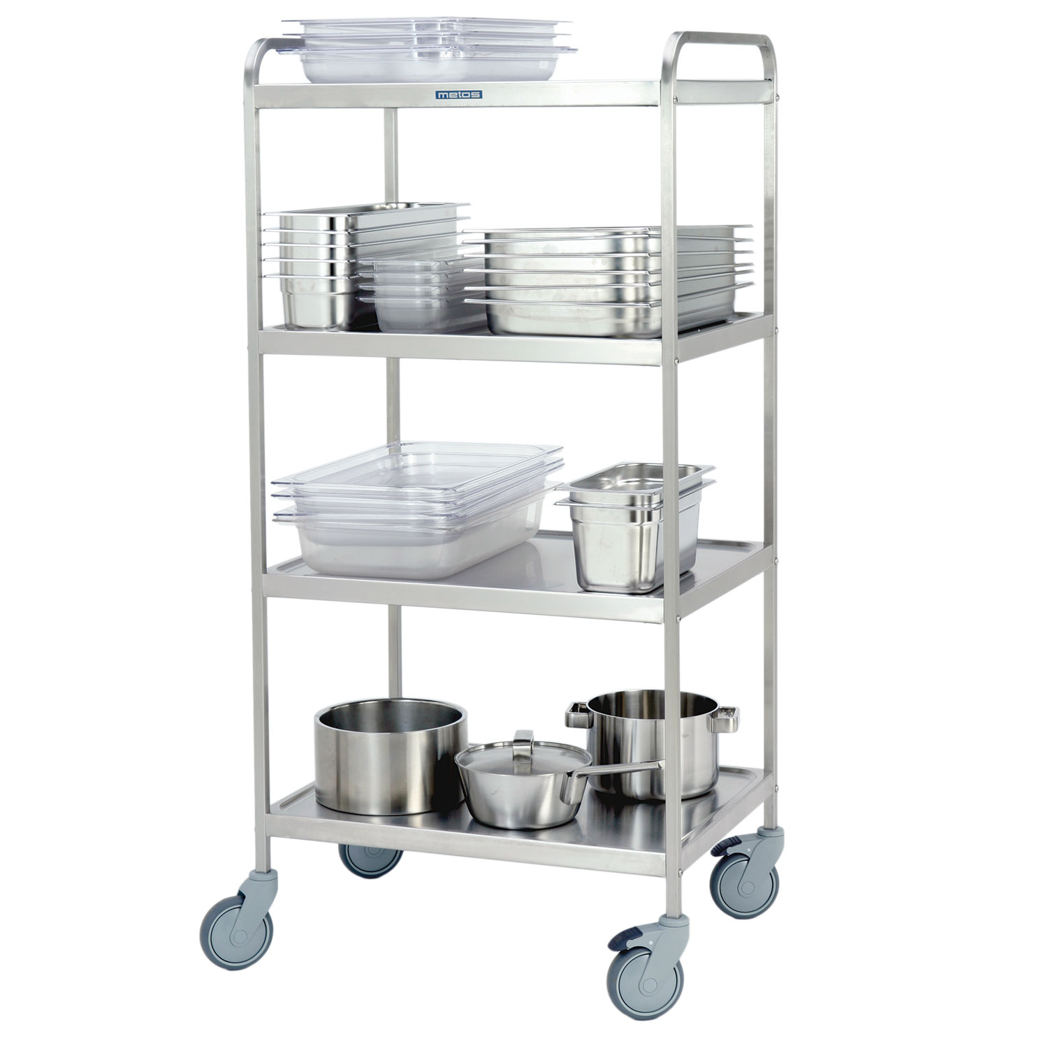 – rungon ja tasojen materiaali ruostumatonta terästä – kevyesti rullaavat kuulalaakeroidut pyörät – pyörien halkaisija 125 mm, jarrut kahdessa pyörässä – neljä 550 x 730 mm. kokoista tasoa – tasojen väli 370 mm – maksimikuorma 120 kg