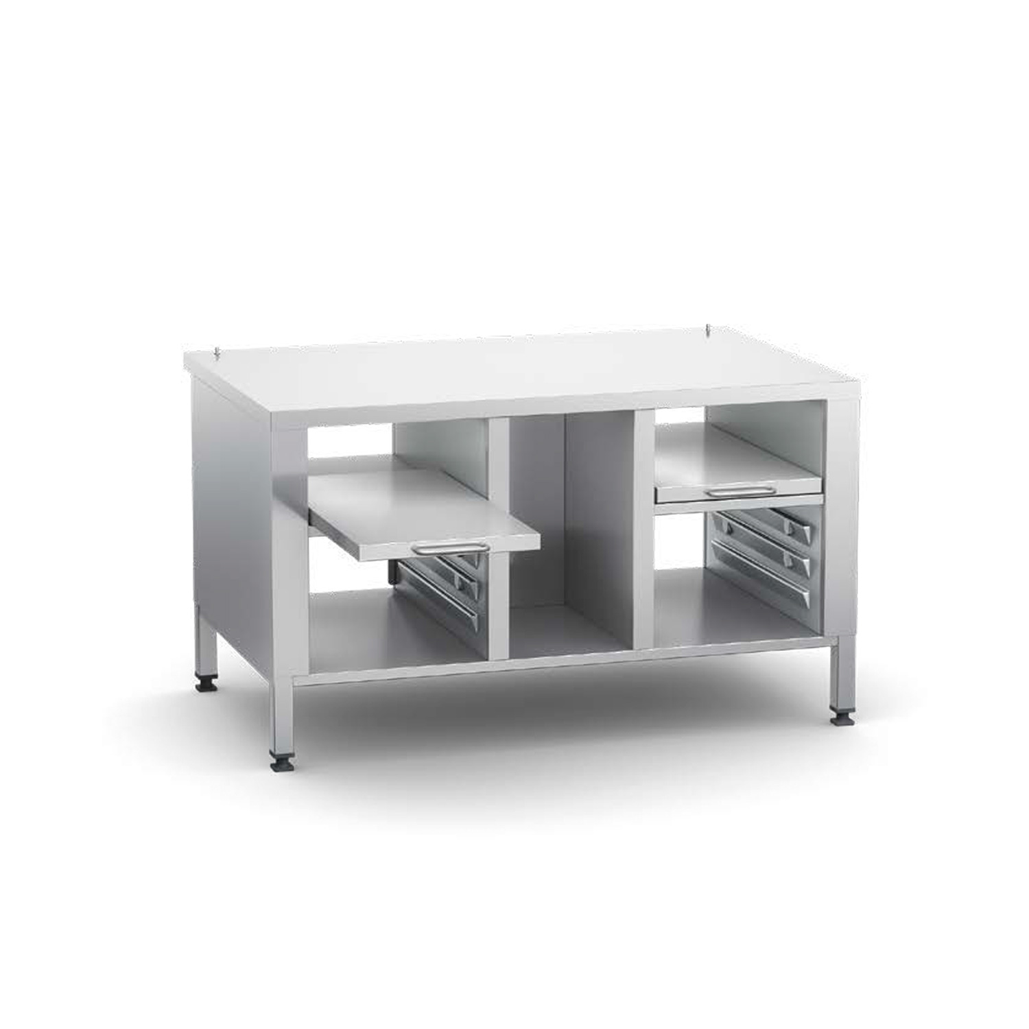 Metos iVario Pro 2-XS voidaan asentaa suoraan jalustalle. Integroidut ulosvedettävät aputasot ja kuusi johdeparia GN-astioiden ja lisävarusteiden säilyttämiseen. Sivuseinät ja yläosa suljettu, takaosa jalustasta avoin.