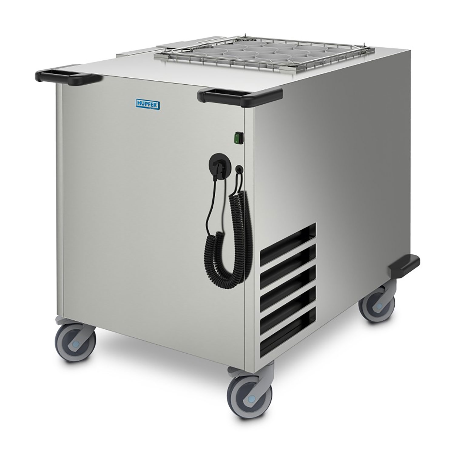 Kompressorilla ja puhaltimella varustettu jäähdyttävä korijakelin keskitettyyn jakeluun, valmiiksi kulhoihin annostelluille kylmille