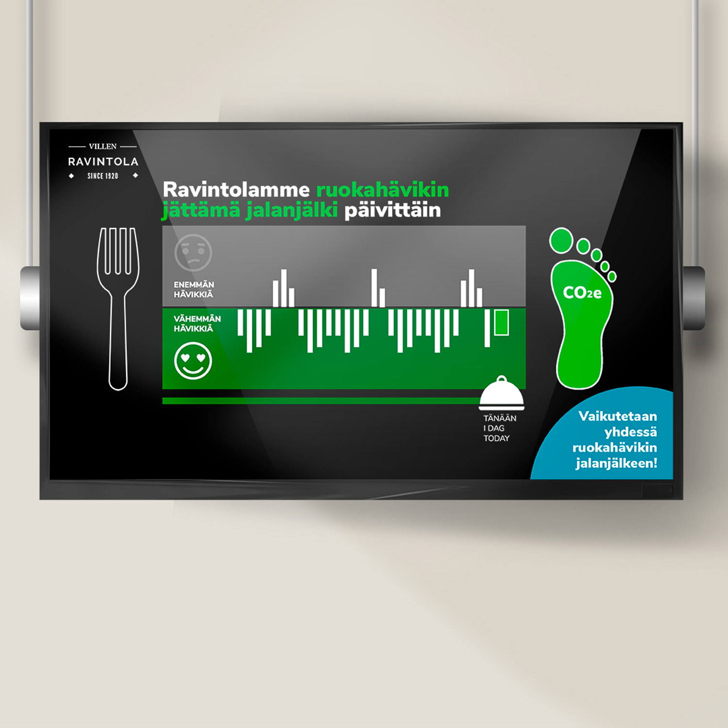 Asiakas tiedostaa millainen ympäristövaikutus syömättä jääneellä ruoalla on. Jäteastian vieressä olevasta monitorista näkee päivän aikana syntyneen jätteen kokonaismäärän. Lisäksi voi seurata myös vertailua siitä, miten määrä suhteutuu pidemmän aikavälin tilastoon.