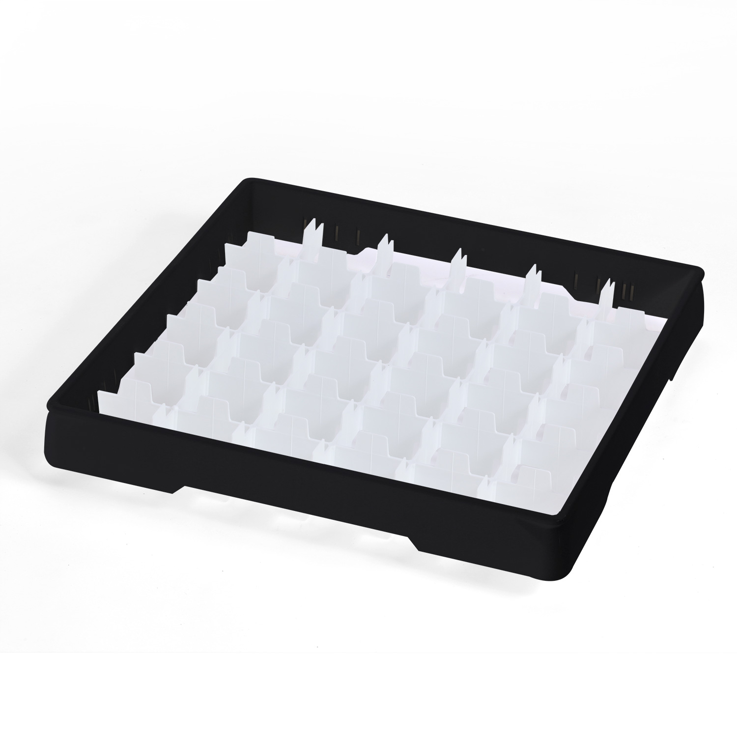 Valkoinen lokerikko 50 x 50 cm kolmellekymmenellekuudelle Ø 72 mm lasille. Mustan kohotuskehyksen korkeus 50 mm, ruiskuvalettu PP-muovia.