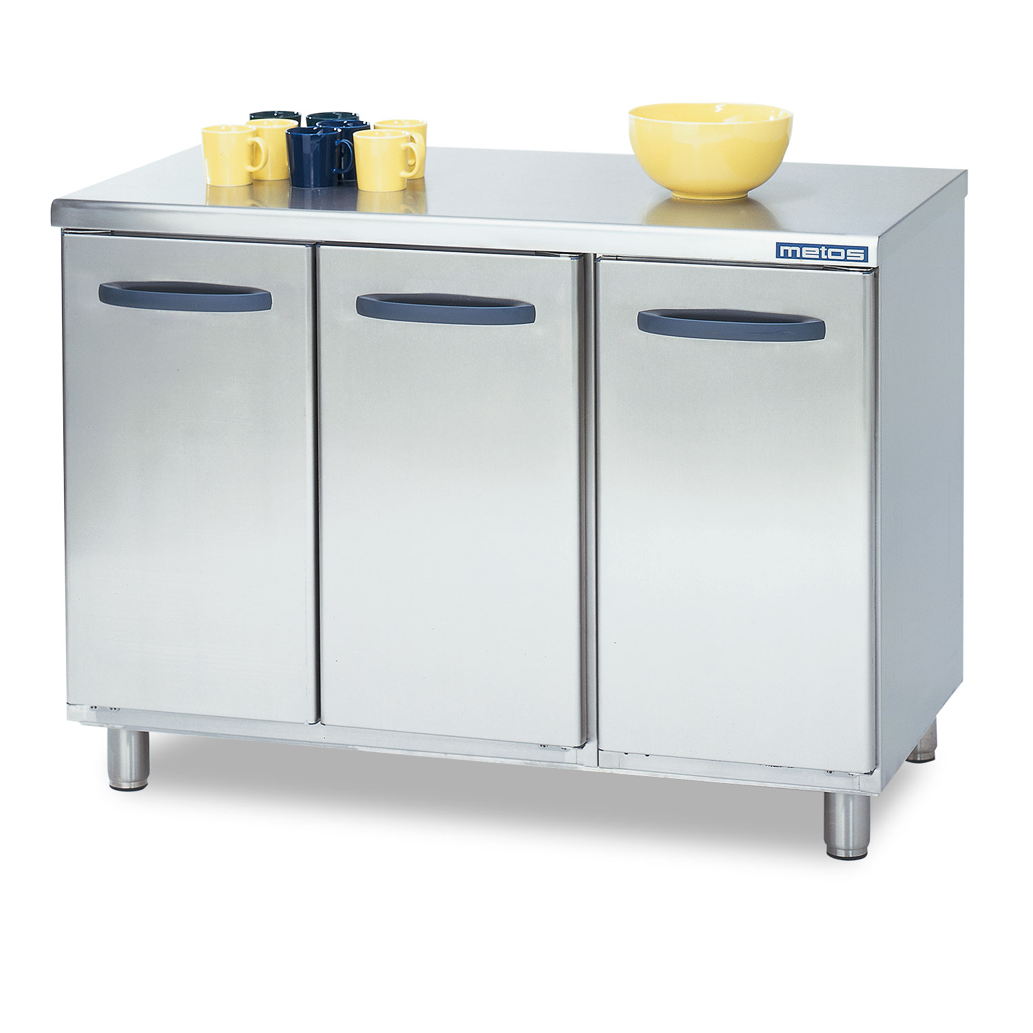– rakenne ruostumattomasta teräksestä – pyöristetyt kulmat – alaosassa kolme kaappia – irrotettava tasohylly, jonka korkeus säädettävissä – säätöjalat