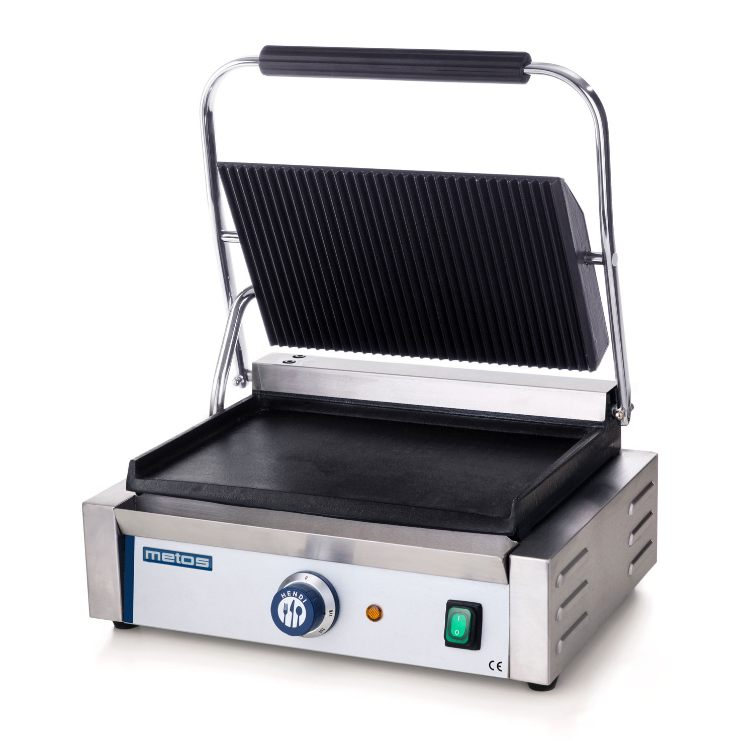 – uritettu ylätaso ja sileä alataso, parilointiala 340 x 230 mm – rst kahva, lämpöeristetty – lämpötila-alue 50-300°C – parilan edessä on irroitettava rasvakaukalo – avattuna korkeus on 530 mm – teräsharja puhdistusta varten – runko RST