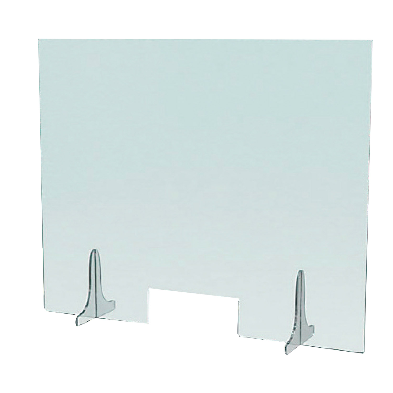 Pöydän päälle vapaasti asetettava pisarasuoja estää tehokkaasti pisaroiden leviämistä asiakaspalvelutilanteessa. – Polykarbonaattia – Palveluaukko alareunassa 280×80 mm – Mitat 700x700x4 mm