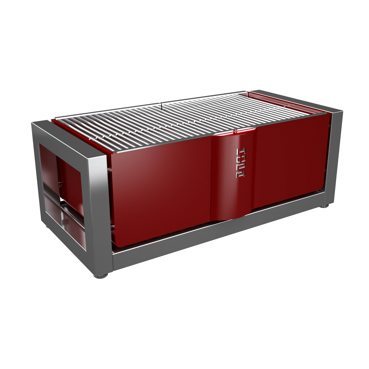 Perinteinen puu-grilli 2000-luvun keittiölle. – Se on hyvin eristetty, jotta estetään ulkoisten pintojen ylikuumeneminen – Tulipesä on vuorattu palo-tiilistä lämmön kertymiseksi ja pitkän käyttöiän varmistamiseksi – punainen