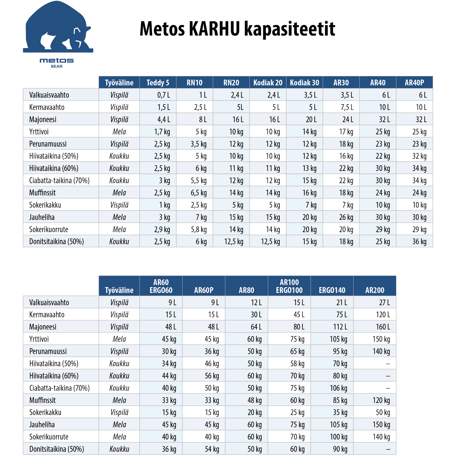 Metos Karhu AR80 VL-1S -yleiskoneen 80 litran kulhon kapasiteetti; 50 kg